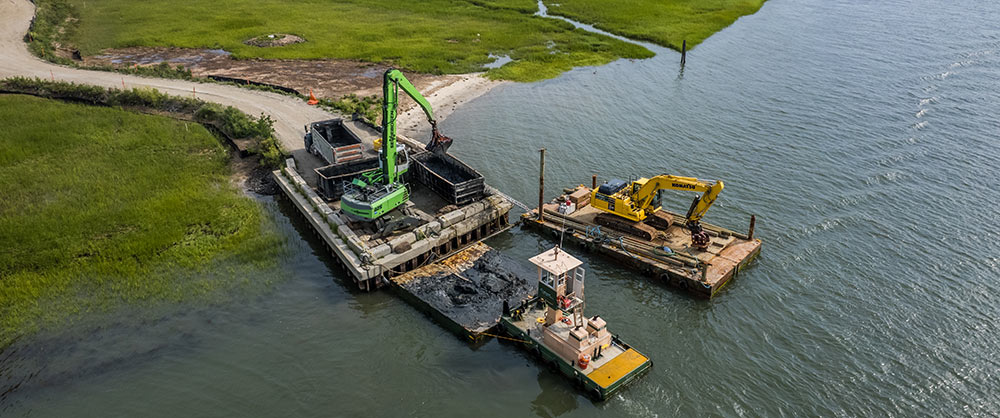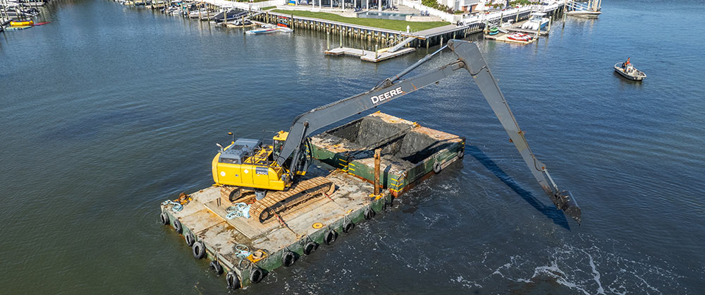 Mechanical dredging is the main focus of our business operations. Most of our dredging is completed during the fall and winter months, depending on the permit requirements and limitations. Mechanical dredging is done by excavating the mud from the dredge area and loading it into hopper barges. The hopper barge is then transported by push boat and offloaded into awaiting sealed triaxle dump trucks. After the material is loaded into the trucks, it is transported to an approved disposal site.